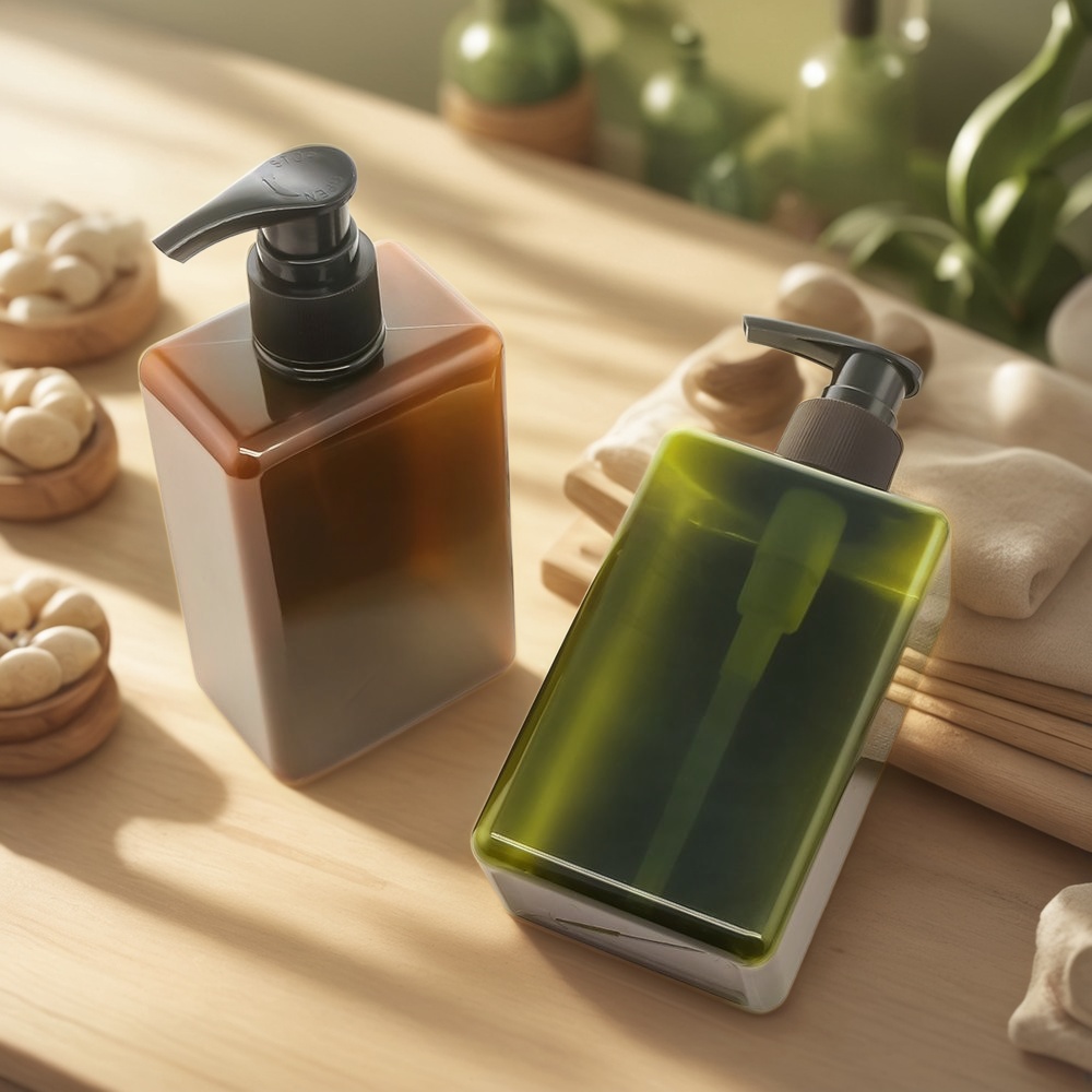 Por que se contentar com uma coleção descombinada de recipientes descartáveis de marca quando você pode criar um visual unificado e sofisticado? Imagine sua bancada adornada com um par de frascos de bomba retangulares e elegantes, um em um âmbar quente e semitransparente e o outro em um verde-oliva relaxante. Estes não são dispensadores comuns; são elementos de design. Suas linhas limpas e formato moderno são intencionalmente eficientes em termos de espaço, trazendo uma sensação de ordem e tranquilidade às suas superfícies. Este tipo de design cuidadoso eleva um simples frasco de plástico de loção de um mero recipiente a uma peça de decoração que complementa estilos de interiores rústicos, industriais ou orgânicos com elegância natural. Ao decantar seus produtos favoritos nesses frascos, você instantaneamente organiza seu espaço e cria uma atmosfera serena, semelhante a um spa.